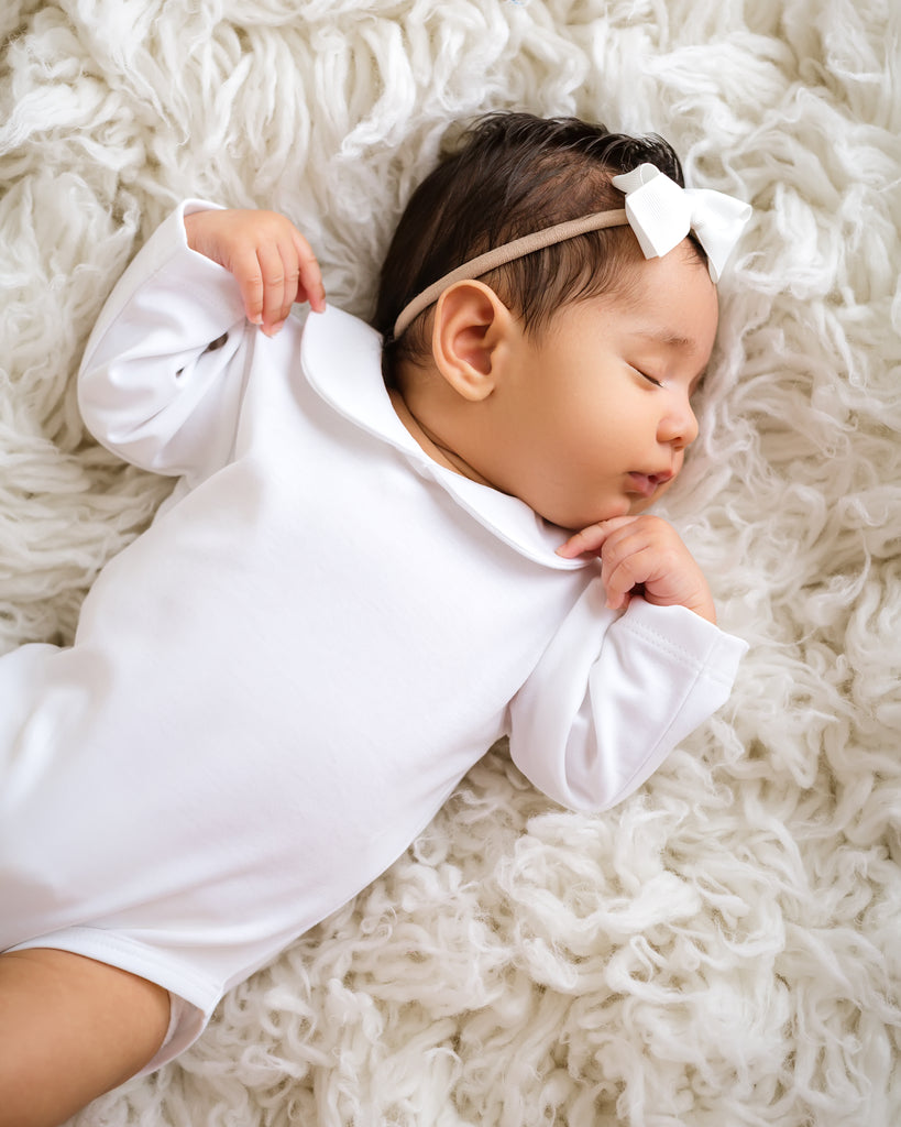 Buttery soft pima onesie with round collar and subtle puff sleeve. An essential basic for every infant wardrobe. Gentle enough for the most sensitive skin.