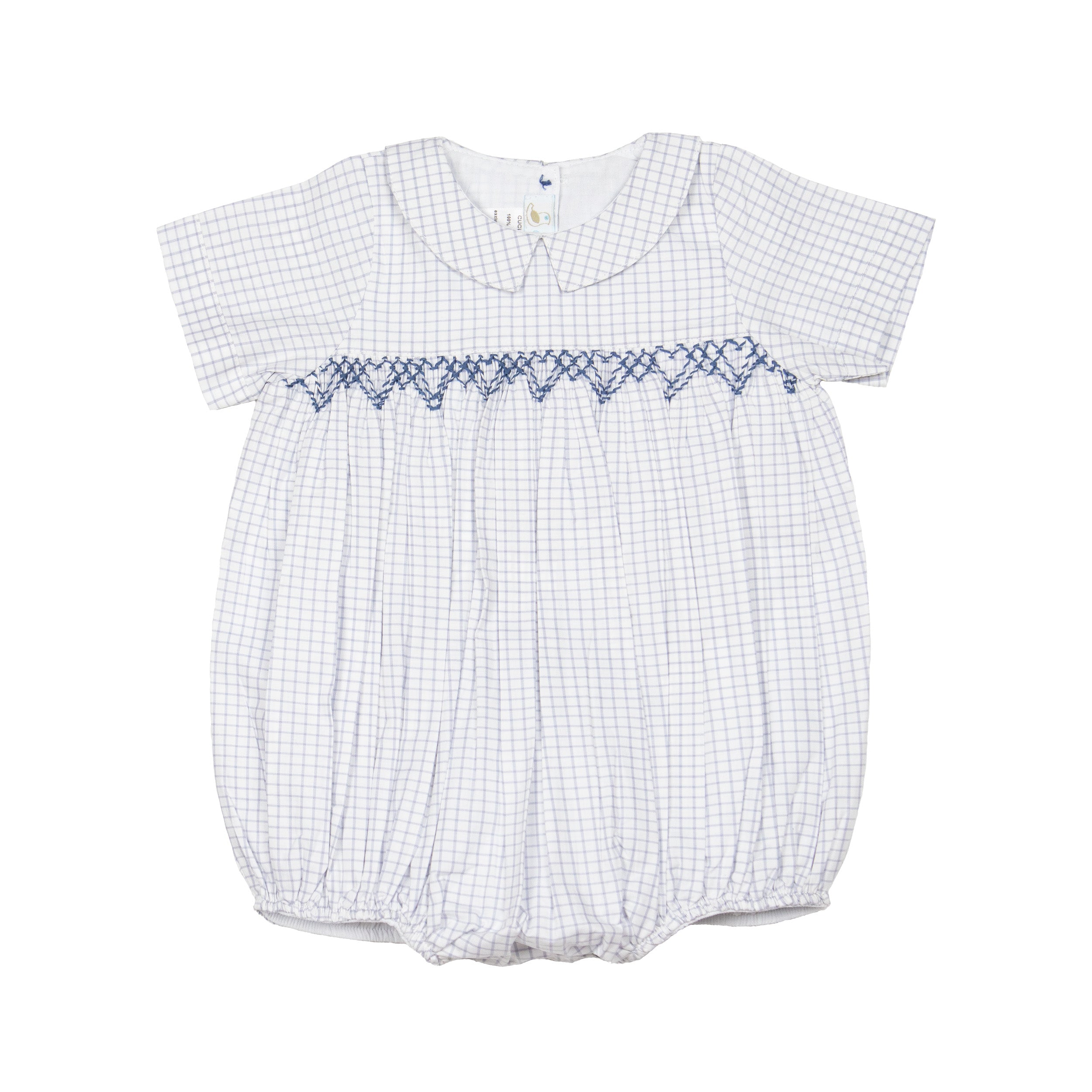 The Oliver Gingham Smocked Bubble Romper has a button closure at the neck and snap opening at the legs. We recommend washing on a gentle cycle and line dry to protect the quality of the outfit.