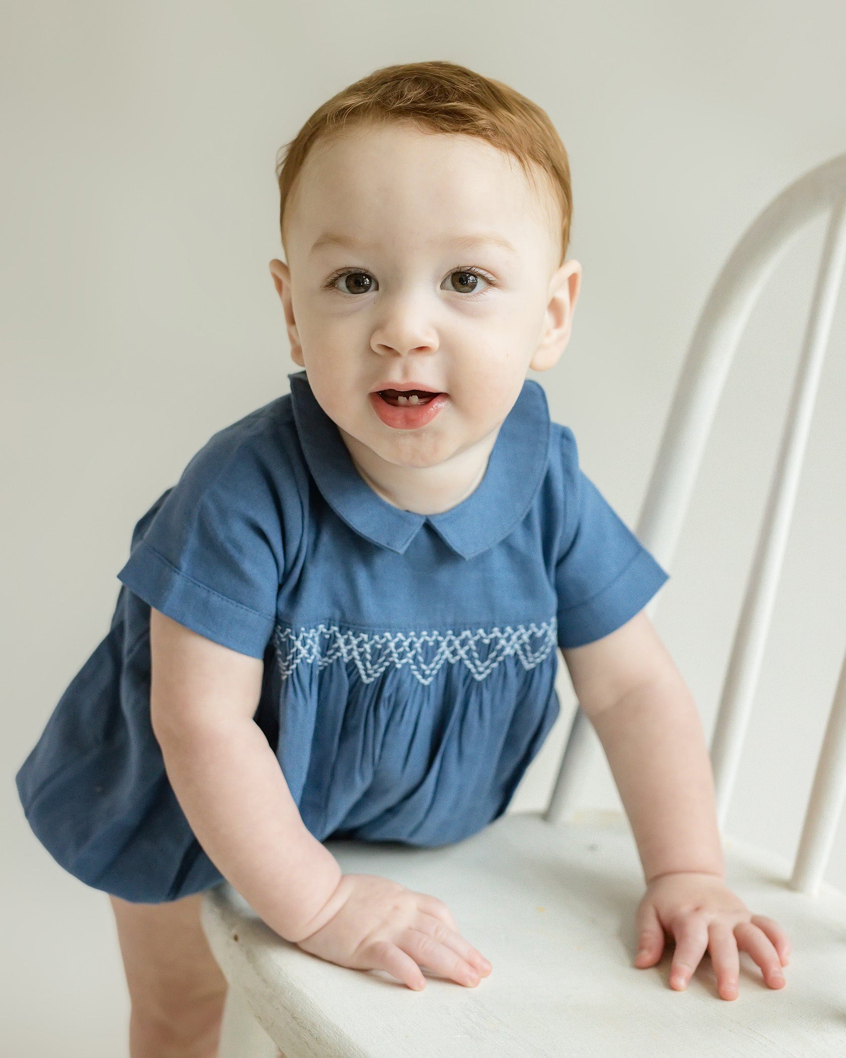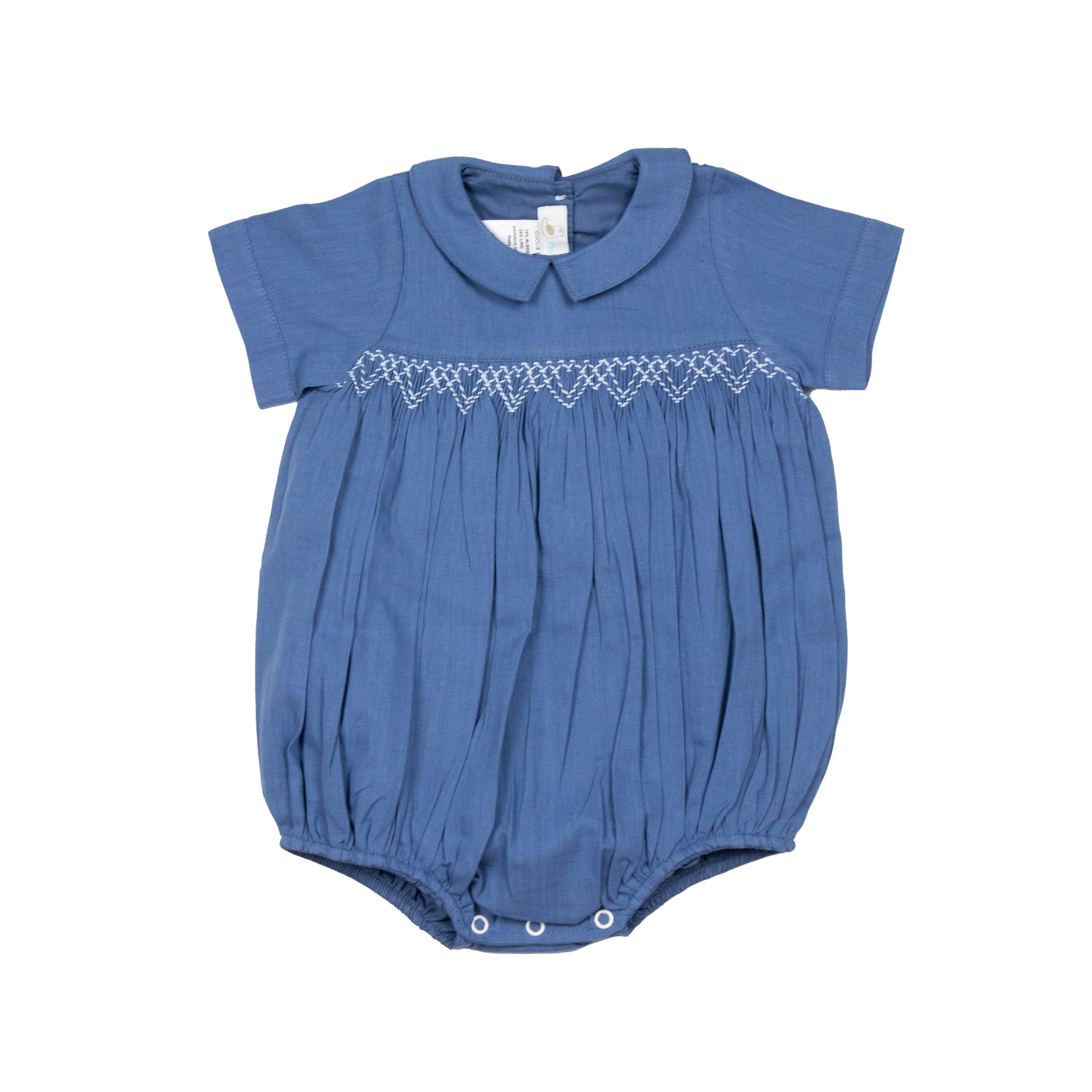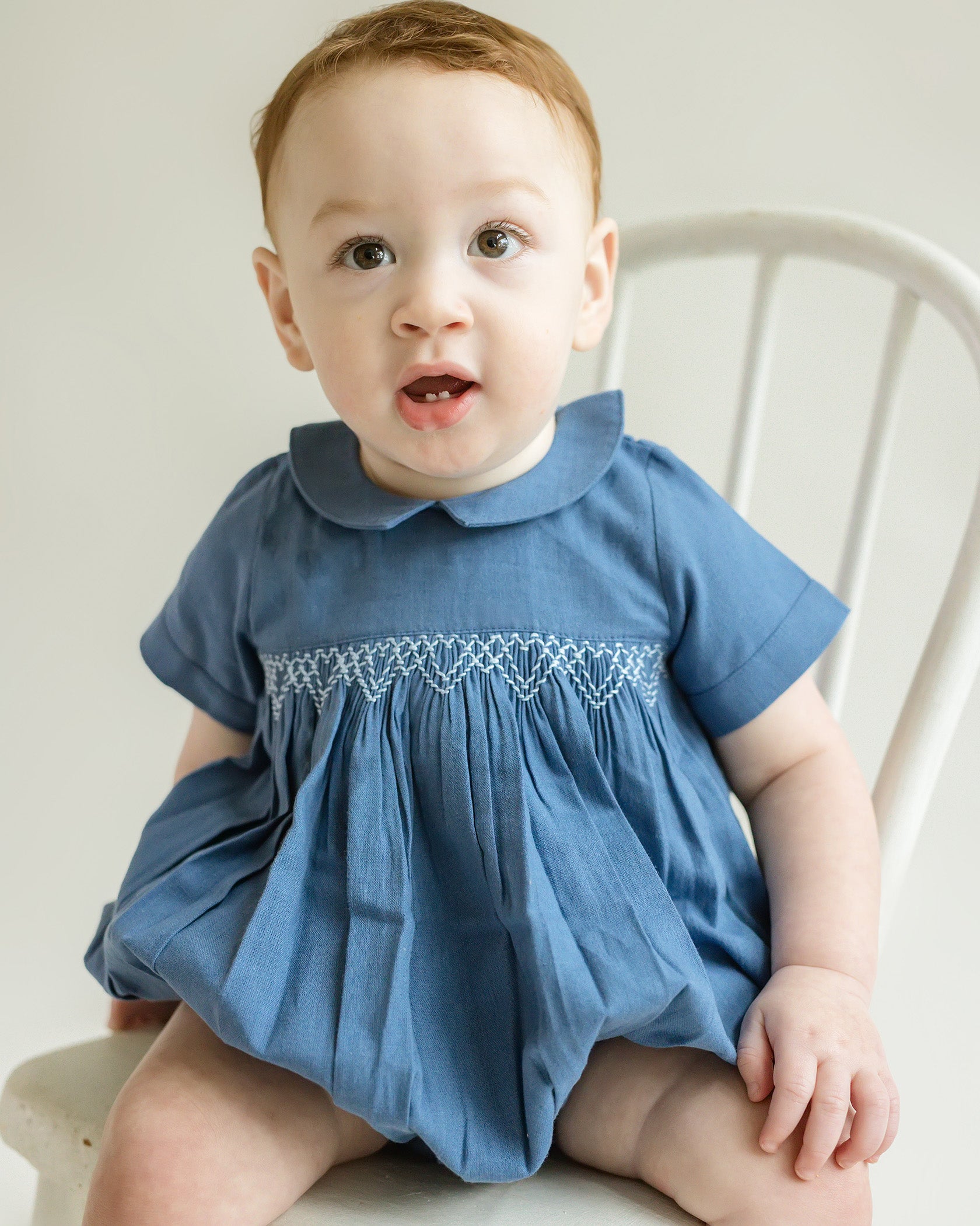 The Oliver Linen Smocked Bubble Romper has a button closure at the neck and snap opening at the legs. We recommend washing on a gentle cycle and line dry to protect the quality of the outfit.