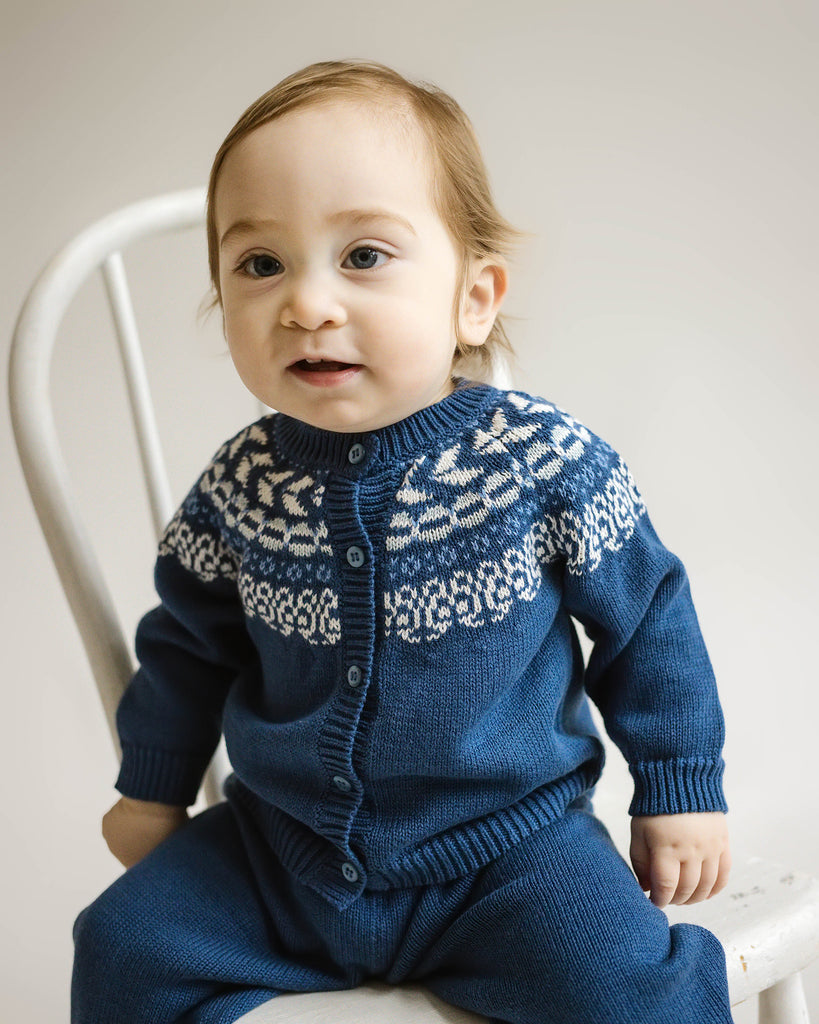 Our Fair Isle Sweater is a timeless layering piece, thoughtfully crafted from a premium blend of Pima cotton and Modal for exceptional softness and comfort. Lightweight yet cozy, this cardigan is perfect for cooler days and easy to layer over shirts, rompers, or one pieces. The smooth, breathable fabric is gentle on sensitive skin and offers just the right amount of stretch for everyday movement. Designed with a clean, classic fit, it adds a polished touch to any outfit — whether you're dressing him up for a special occasion or keeping it casual. A versatile essential made to wear, share, and hand down.
