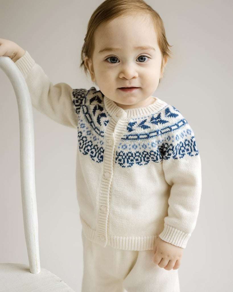 Our Fair Isle Sweater is a timeless layering piece, thoughtfully crafted from a premium blend of Pima cotton and Modal for exceptional softness and comfort. Lightweight yet cozy, this cardigan is perfect for cooler days and easy to layer over shirts, rompers, or one pieces. The smooth, breathable fabric is gentle on sensitive skin and offers just the right amount of stretch for everyday movement. Designed with a clean, classic fit, it adds a polished touch to any outfit — whether you're dressing him up for a special occasion or keeping it casual. A versatile essential made to wear, share, and hand down.