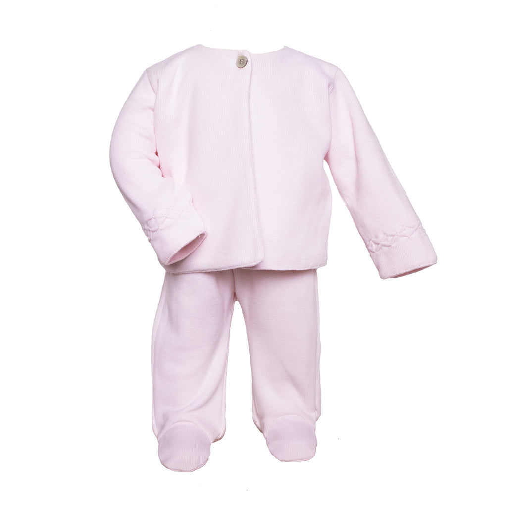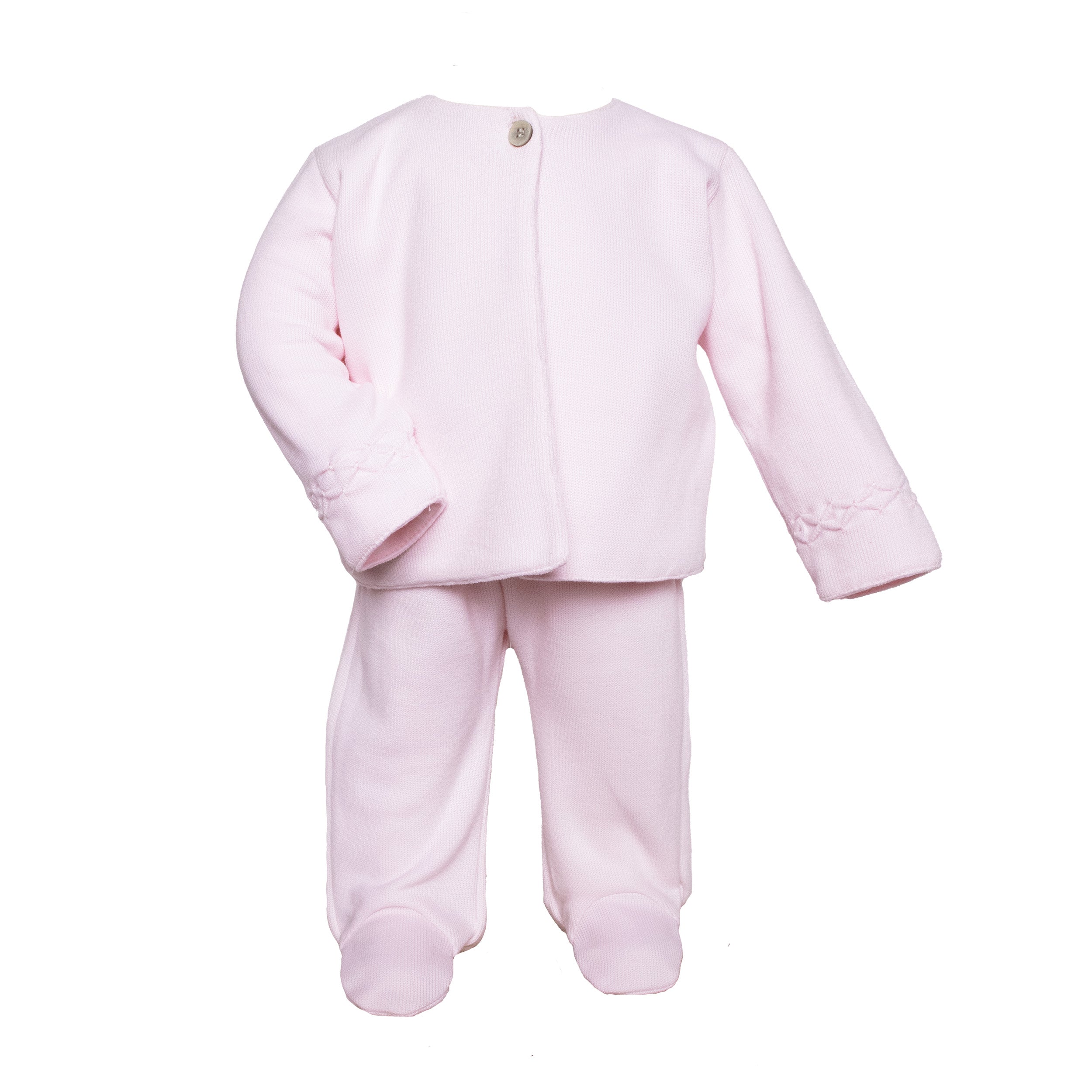 The set includes a single-button jacket with delicate hand-smocked detailing at the sleeves, paired with footed pull-on pants for a cozy, polished look.