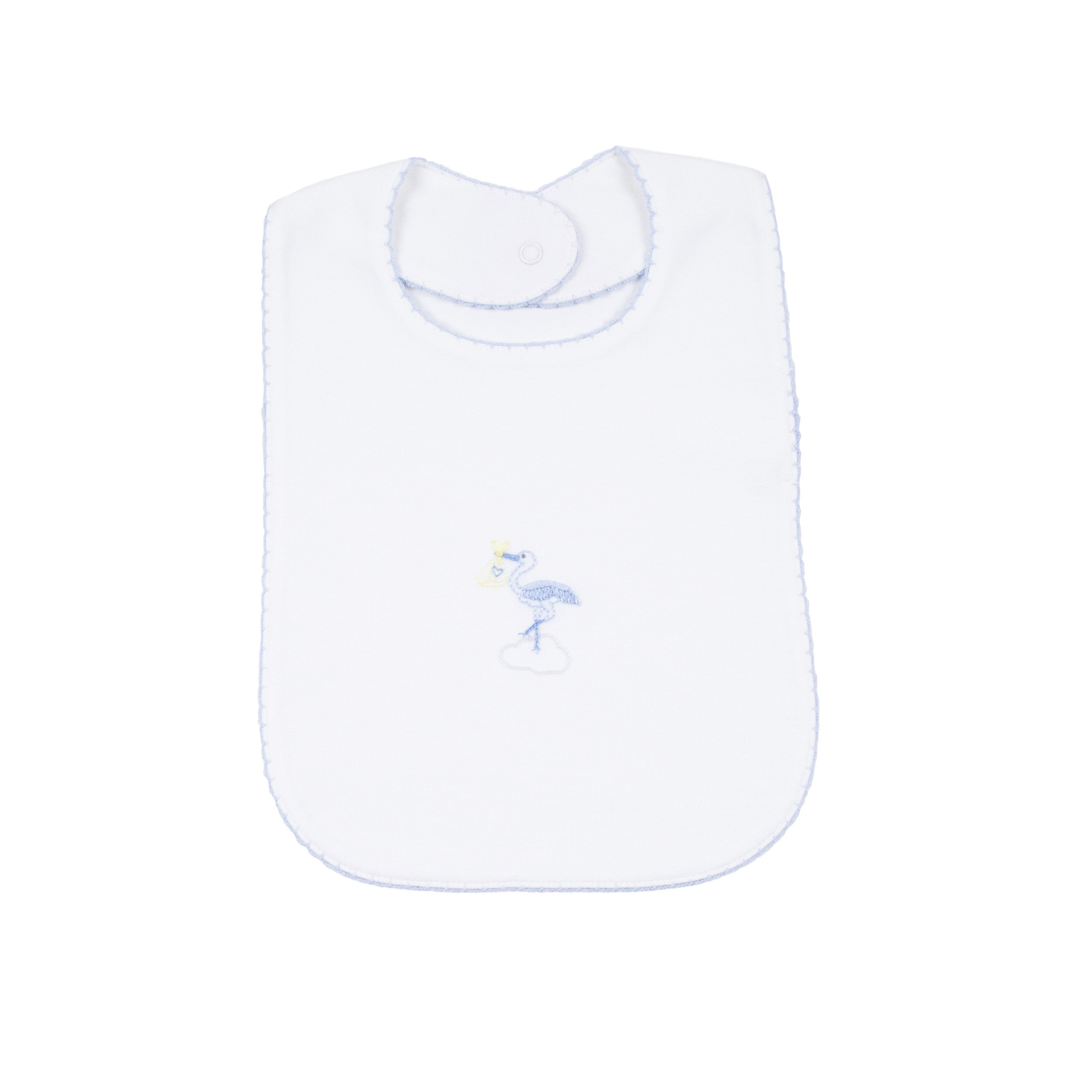 Add a touch of timeless charm to your little one’s wardrobe with this 100% Pima cotton bib, crafted for softness and comfort. Featuring a beautifully hand-embroidered stork design and delicate contrast trim, it’s the perfect accessory to complement our classic layette collection.