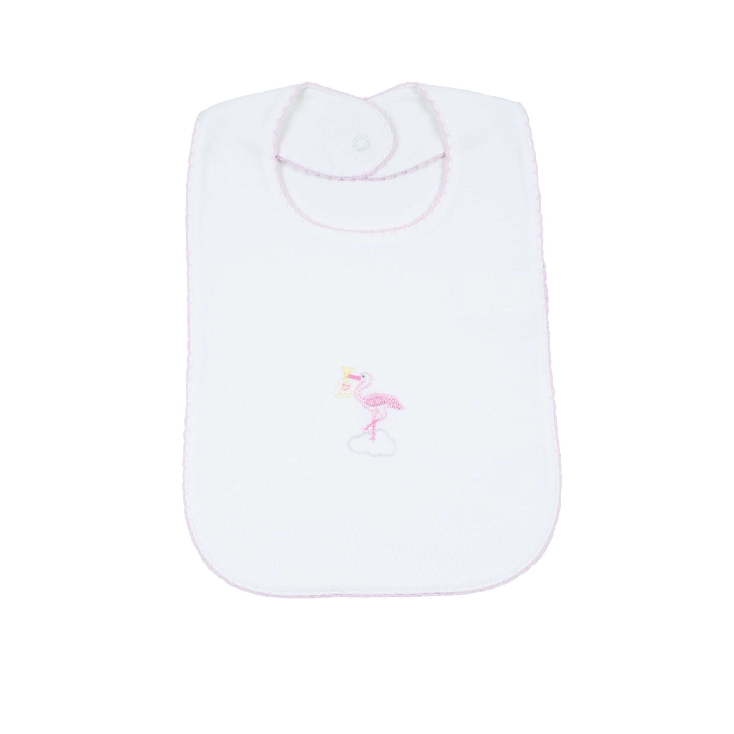 Add a touch of timeless charm to your little one’s wardrobe with this 100% Pima cotton bib, crafted for softness and comfort. Featuring a beautifully hand-embroidered stork design and delicate contrast trim, it’s the perfect accessory to complement our classic layette collection.
