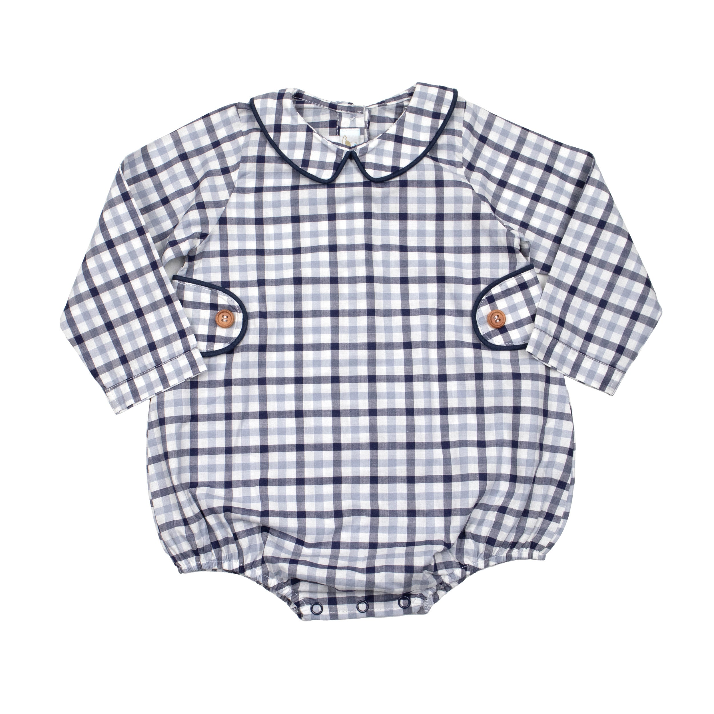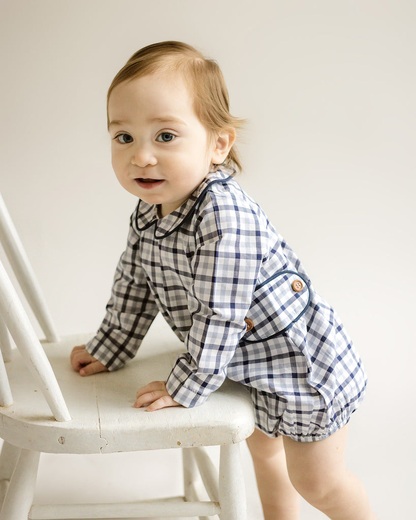 Our Oliver bubble romper is the perfect romper to wear for this transitional season. This soft, classic romper is made of 100% cotton and features a contrast navy trim and button tab detail. Suitable for any occasion, this long-sleeved romper is perfect to wear on its own or layered with our corduroy Jon Jon.
