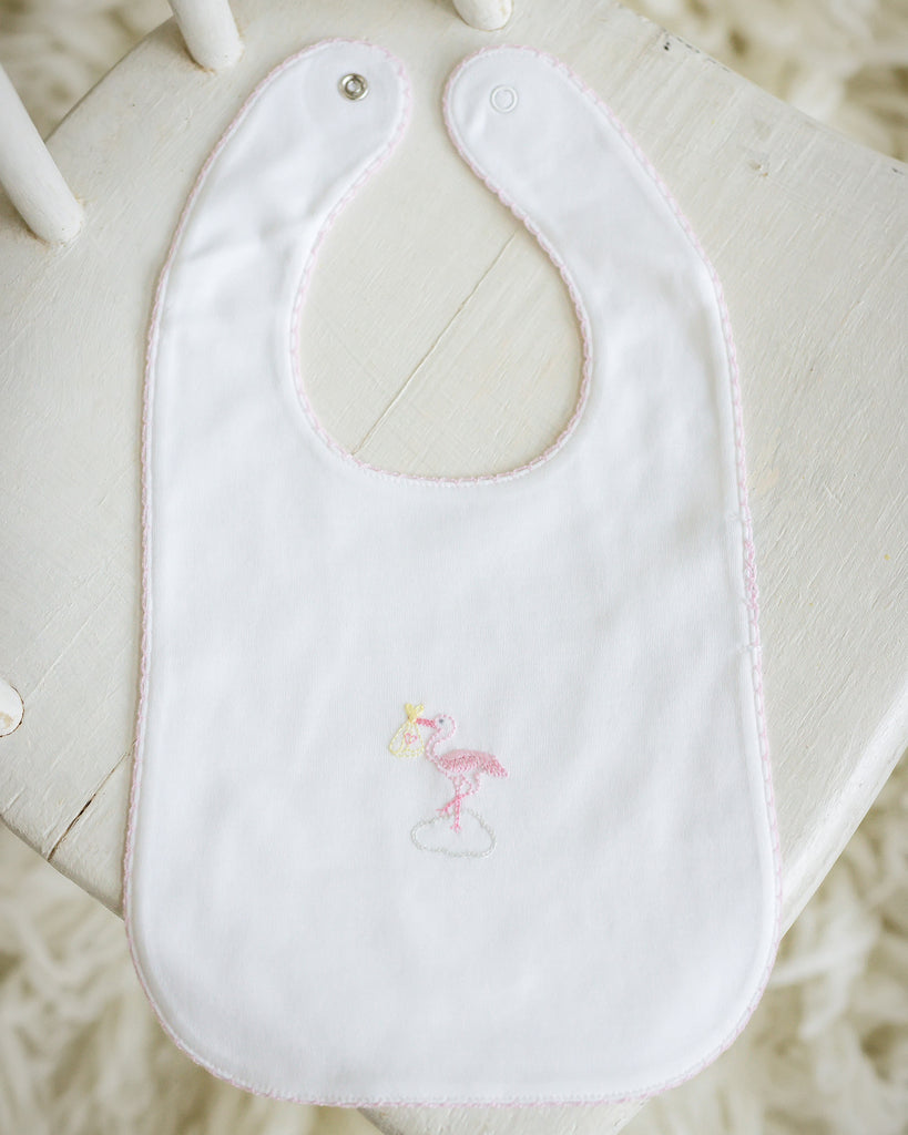 Add a touch of timeless charm to your little one’s wardrobe with this 100% Pima cotton bib, crafted for softness and comfort. Featuring a beautifully hand-embroidered stork design and delicate contrast trim, it’s the perfect accessory to complement our classic layette collection.
