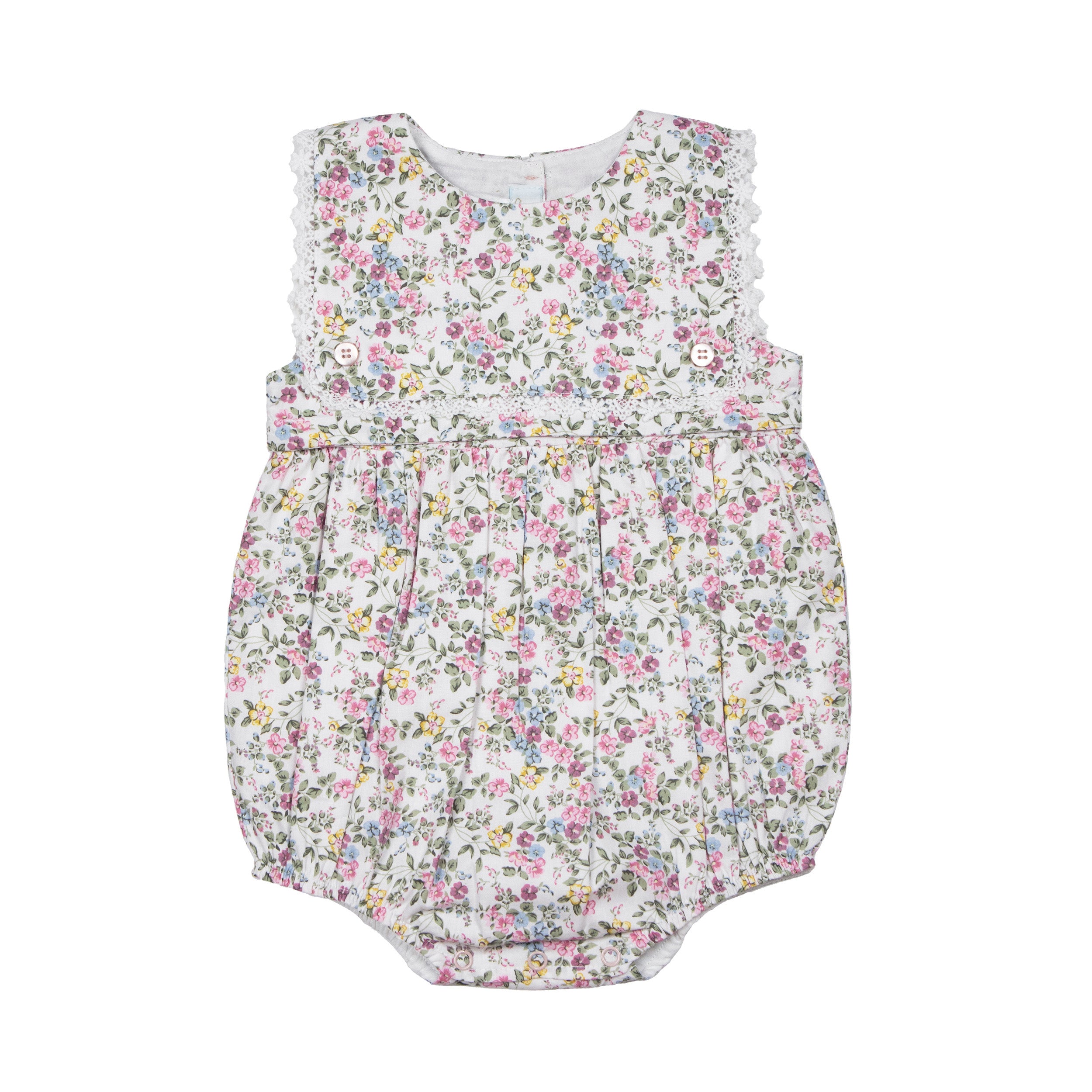 Our Colette Bubble Romper is a lace trimmed baby girl outfit with a playfully elegant fit. This 100% Cotton romper features a fabric with a beautiful floral print. The petite flowers in this print are the sweetest shades of pink, yellow and blue. The lace trim and fabric detail gives this outfit an elegant look. Heirloom quality made with the utmost care.