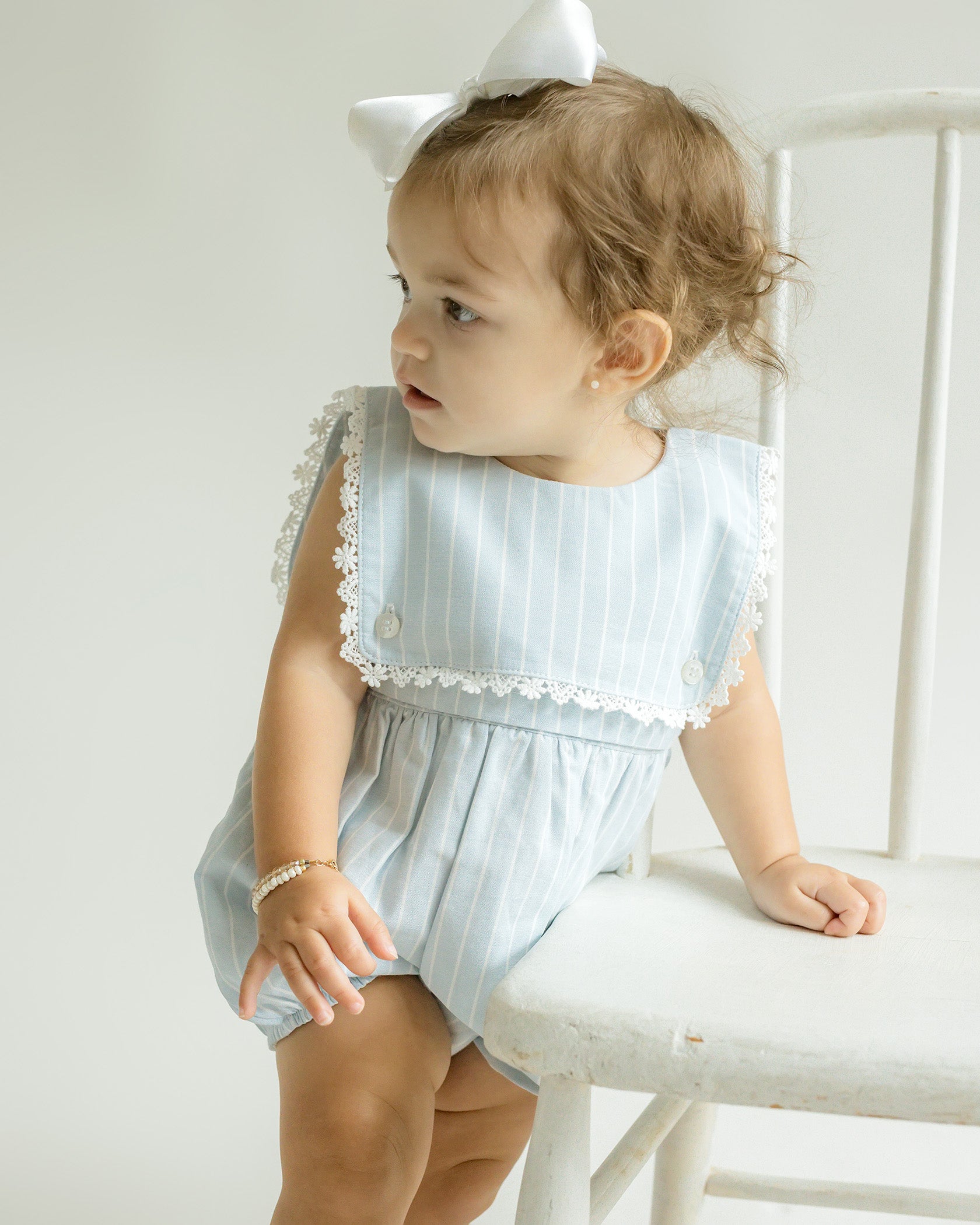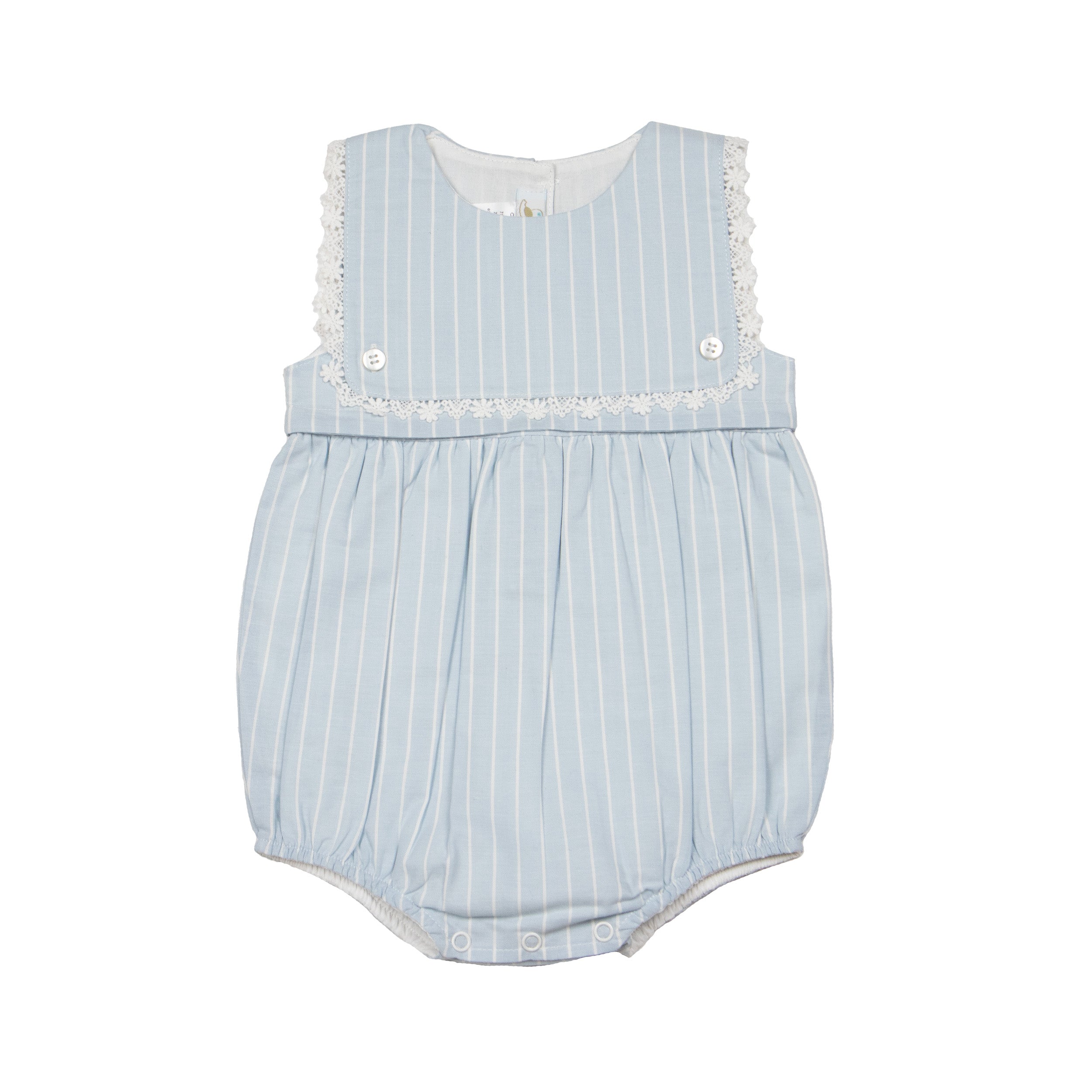 Our Colette Bubble Romper is a lace trimmed baby girl outfit with a playfully elegant fit. This Pima Cotton and Linen blend romper features a striped fabric with ivory pinstripe. The classic stripe and shape of the bubble is a nod a nautical style. The lace trim and fabric detail gives this outfit an elegant look. Heirloom quality made with the utmost care.