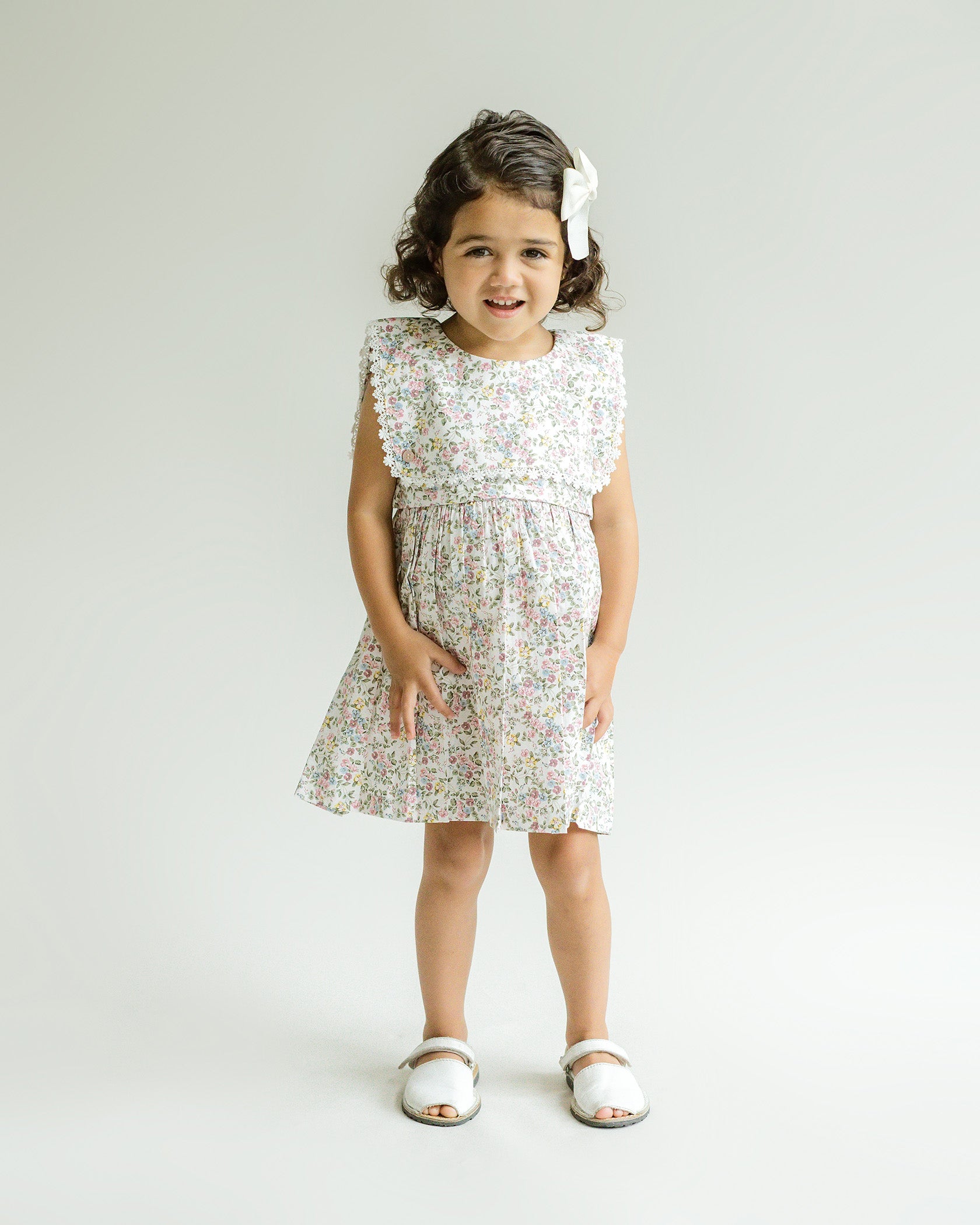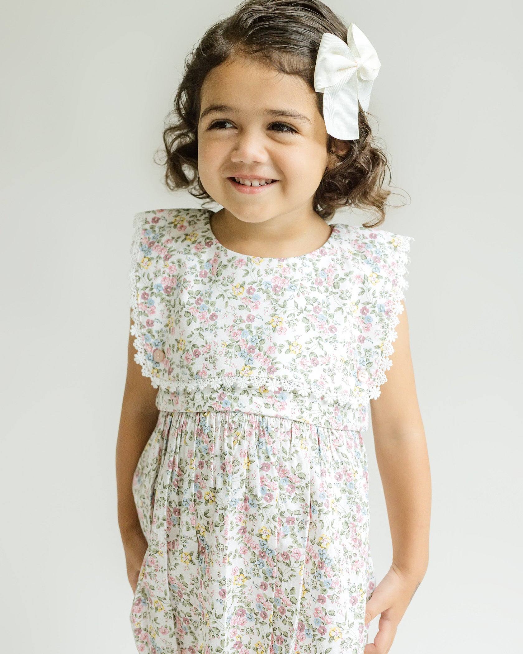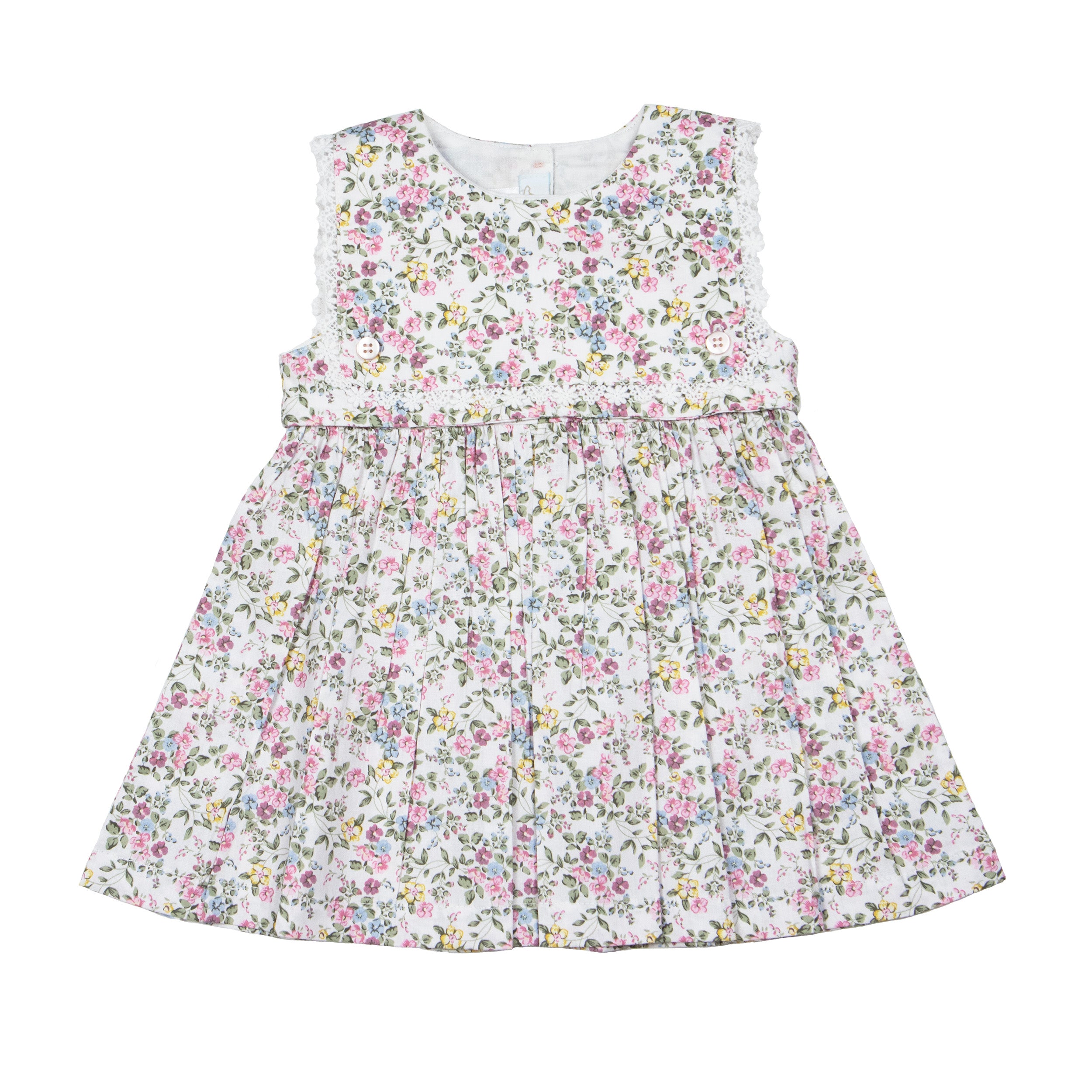 Our Colette Dress is a lace trimmed baby girl outfit with a playfully elegant fit. This 100% Cotton dress features a fabric with a beautiful floral print. The petite flowers in this print are the sweetest shades of pink, yellow and blue. The lace trim and fabric detail gives this outfit an elegant look. Heirloom quality made with the utmost care.
