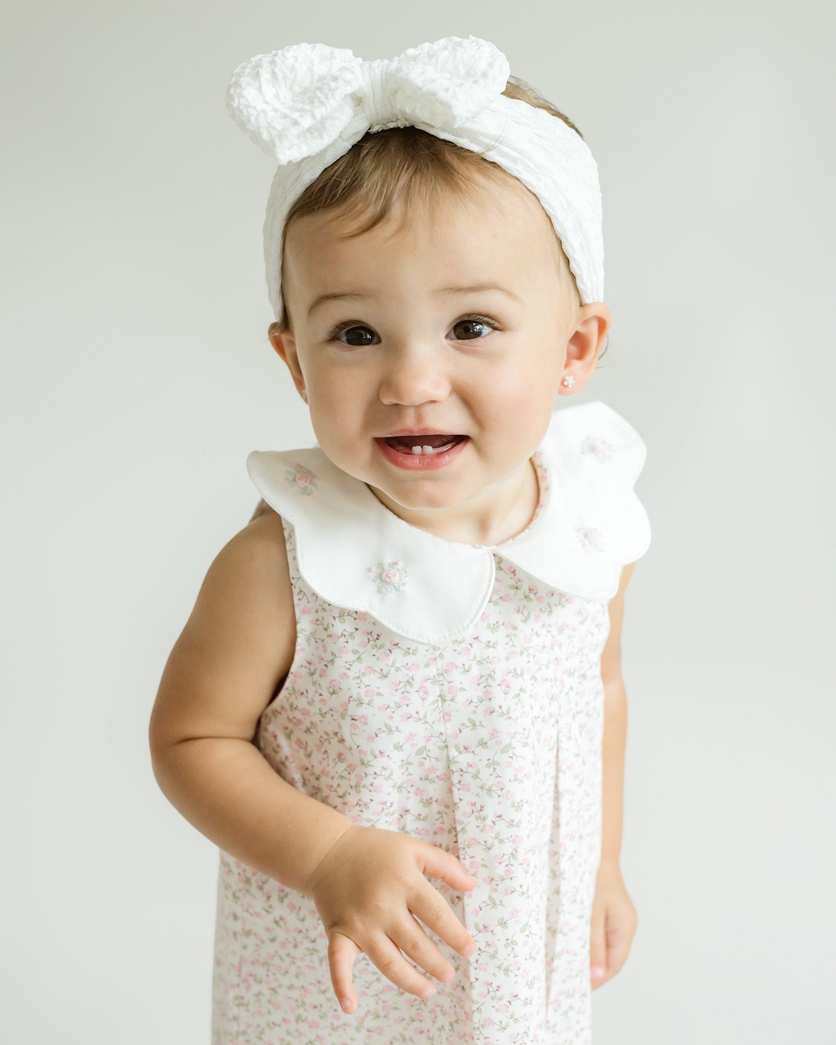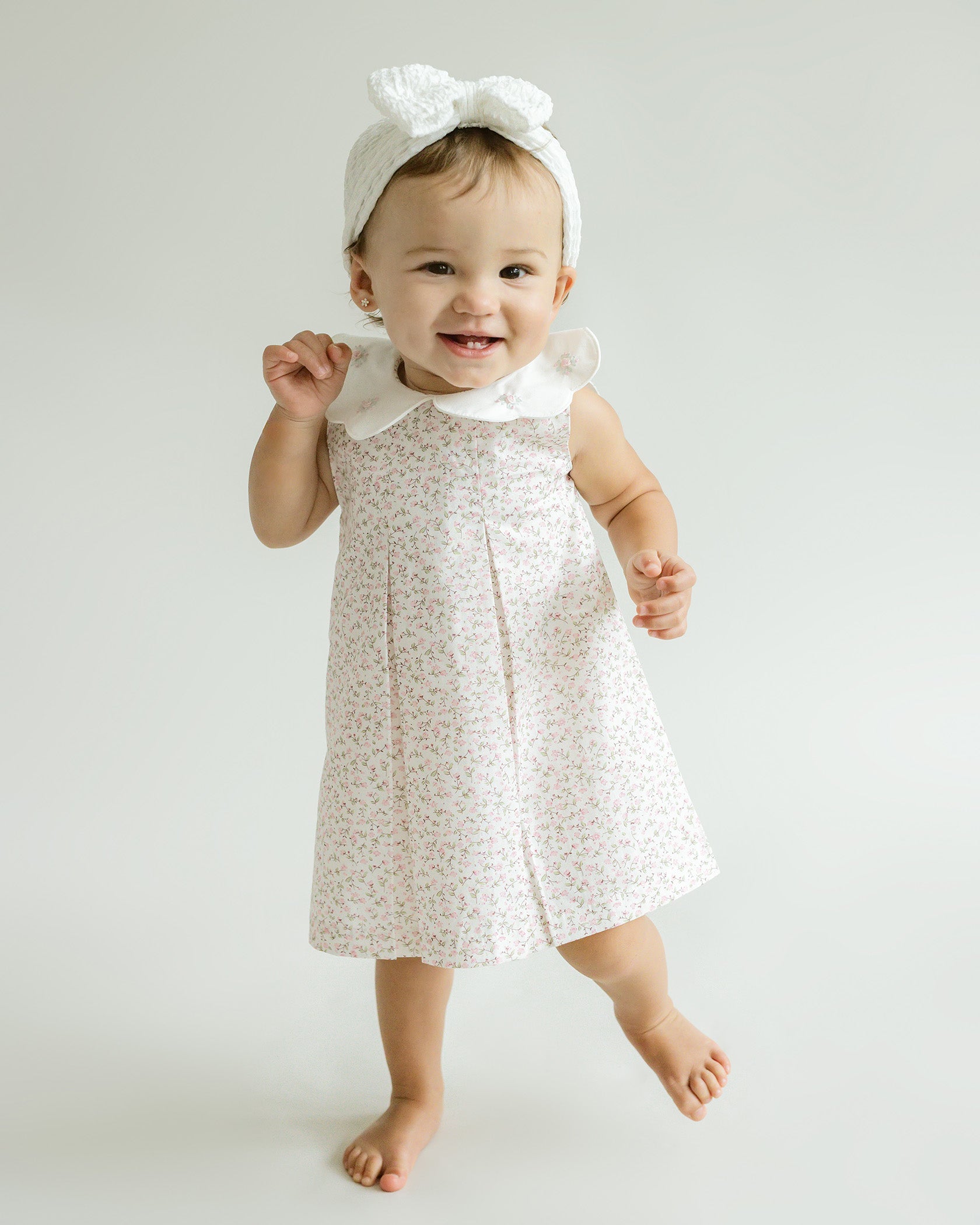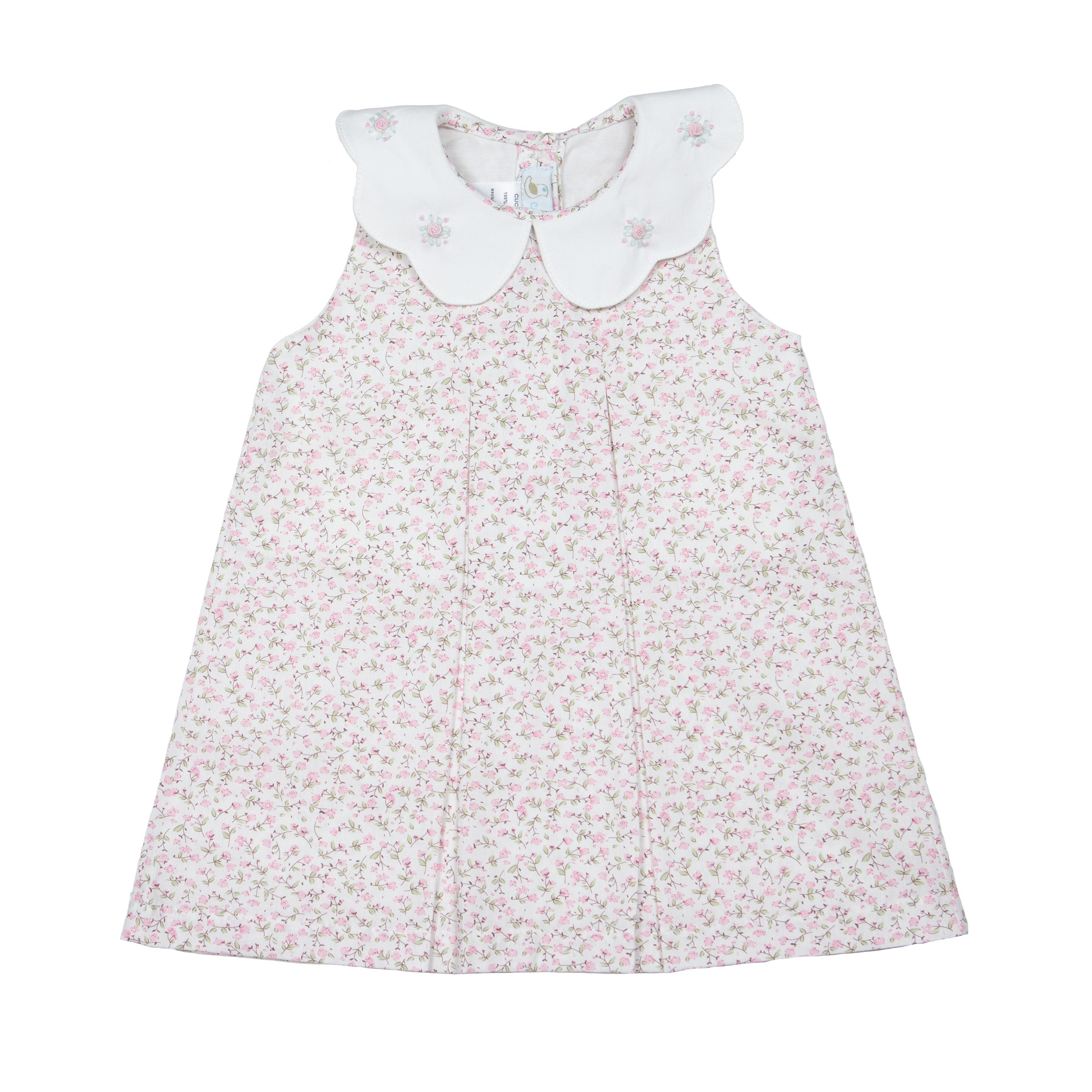 Our Sophie Dress is a hand embroidered baby girl outfit with a perfectly elegant fit. This 100% Cotton dress and bloomers feature a fabric with a beautiful floral print. The petite flowers in this print are the sweetest shade of pink. The white scalloped collar with hand embroidered details gives this style an elevated look. Heirloom quality made with the utmost care.