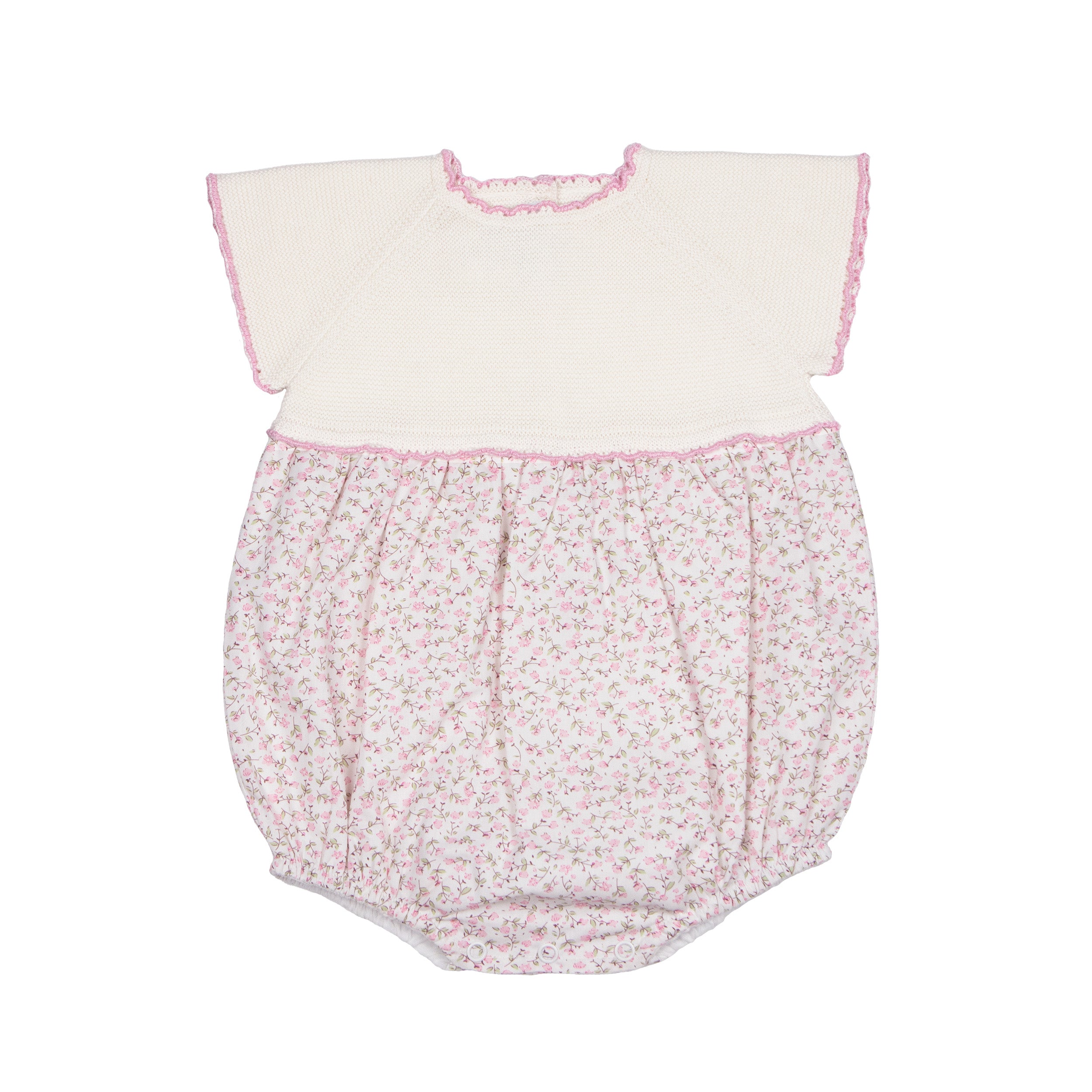 Our Sophie Knit Bubble Romper is a hand finished baby girl outfit with a perfectly elegant fit. This Pima Blend knit and floral fabric romper feature a fabric with a beautiful floral print. The petite flowers in this print are the sweetest shade of pink. The knit top with contrast color trim gives this style an elevated look. Heirloom quality made with the utmost care.