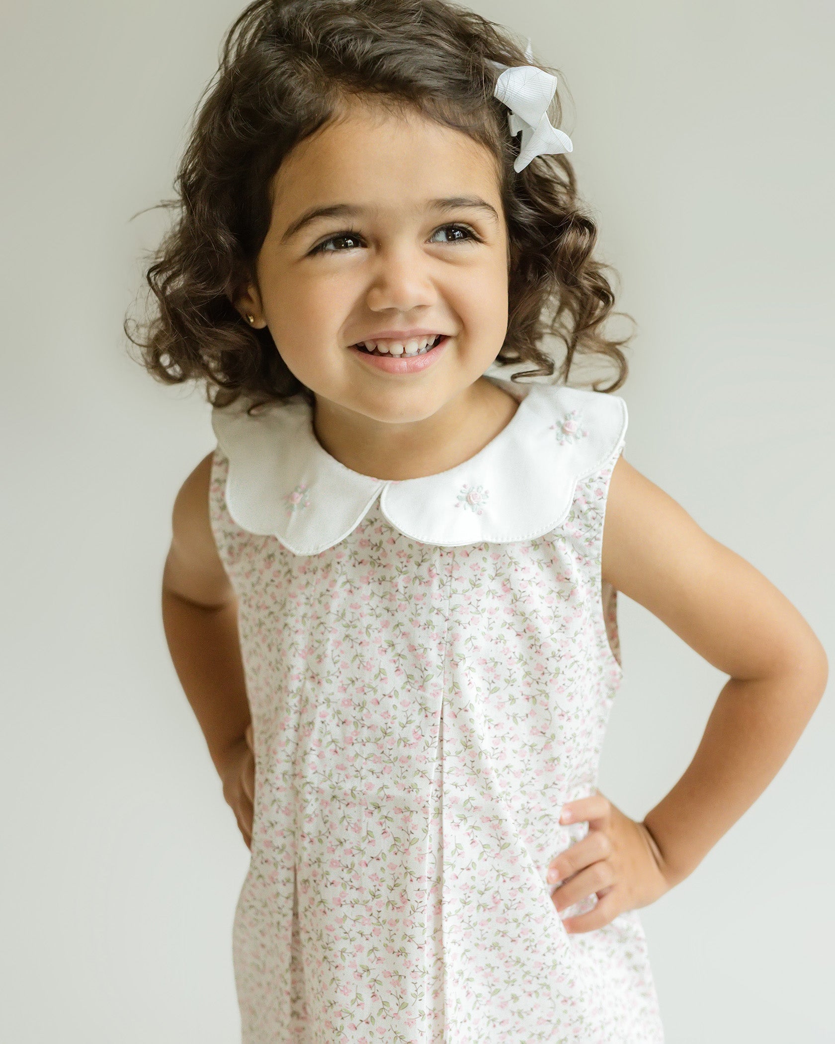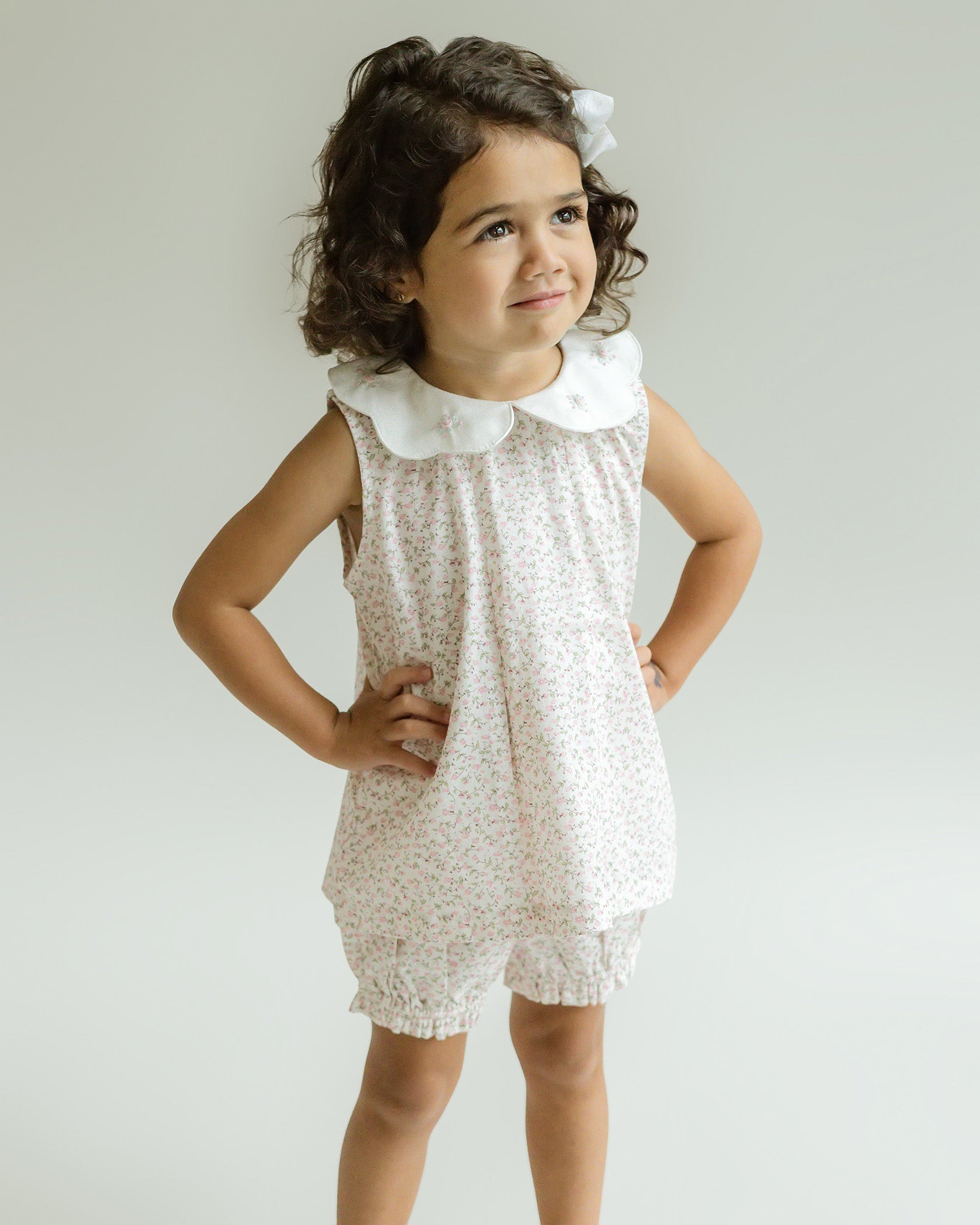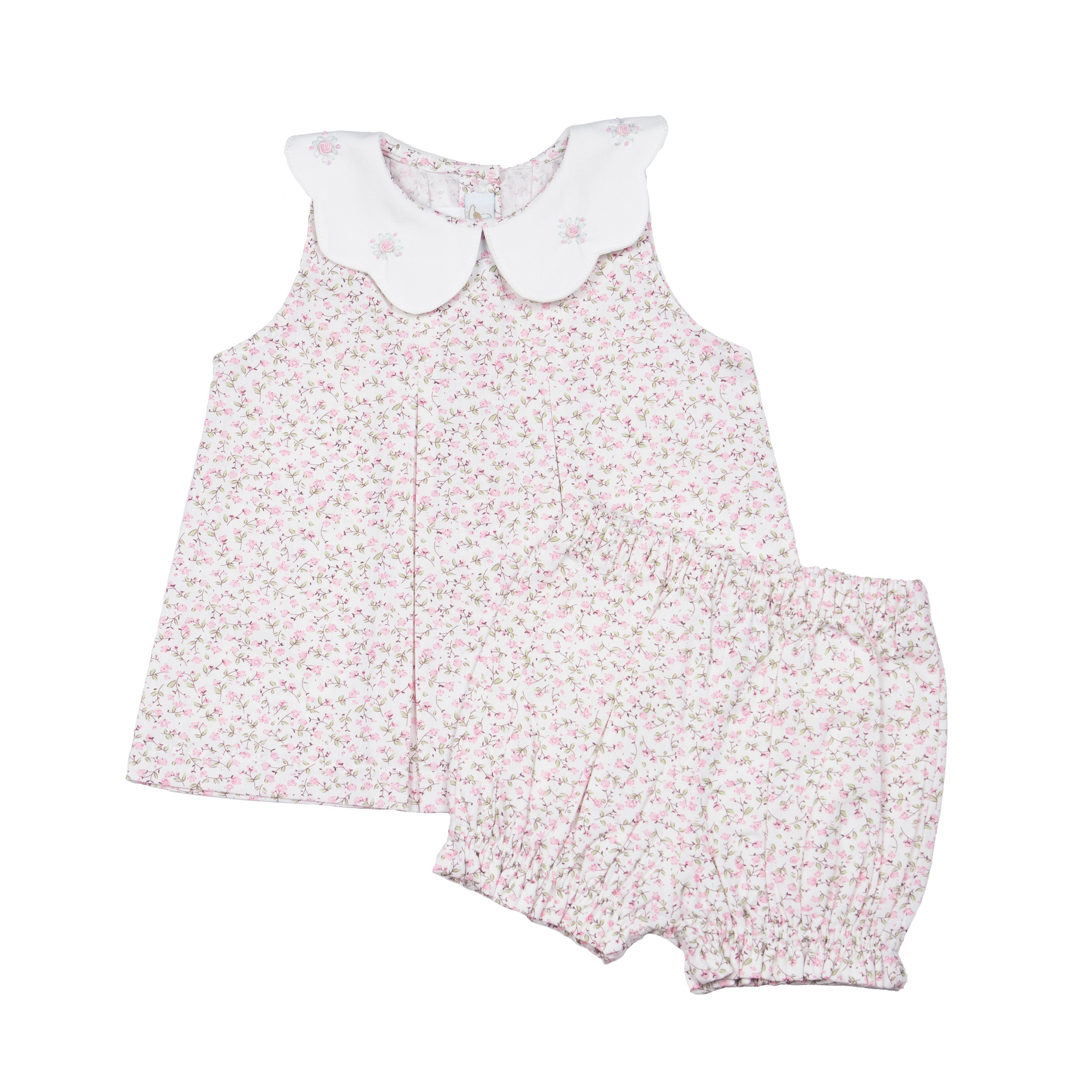 Our Sophie Short Set is a hand embroidered baby girl outfit with a perfectly elegant fit. This 100% Cotton top and shorts feature a fabric with a beautiful floral print. The petite flowers in this print are the sweetest shade of pink. The white scalloped collar with hand embroidered details gives this style an elevated look. Heirloom quality made with the utmost care.